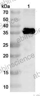 Western blot analysis was performed using anti-EV71-VP1 polyclonal antibody at 1ug/mL on various samples. Lane 1: recombinant EV71 VP1/Capsid protein VP1 (Catalog No: VK633012)