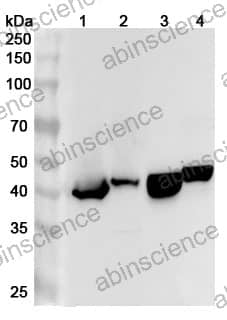 Western blot analysis was performed using anti-GATM1 polyclonal antibody at 1ug/mL on various samples. Lane 1: Mouse kidney lysate Lane 2: Mouse pancears lysate Lane 3: Rat kidney lysate Lane 4: Rat pancears lysat
