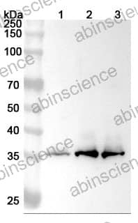 Western blot analysis was performed using anti-STX4 polyclonal antibody at 1ug/mL on various samples. Lane 1: Hela cell lysate Lane 2: HL-60 cell lysate Lane 3: K562 cell lysate
