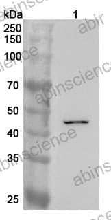 Western blot analysis was performed using anti-DUSP7 polyclonal antibody at 1ug/mL on various samples. Lane 1: Mouse heart lysate