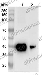 Western blot analysis was performed using anti-ASGR1 polyclonal antibody at 1ug/mL on various samples. Lane 1: Mouse liver lysate Lane 2: Rat liver lysate