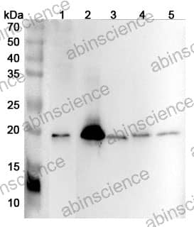 Western blot analysis was performed using anti-BID polyclonal antibody at 1ug/mL on various samples. Lane 1: Jurkat cell lysate Lane 2: Mouse spleen lysate Lane 3: Mouse thymus lysate Lane 4: Rat spleen lysate Lane 5: Rat thymus lysate
