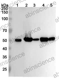 Western blot analysis was performed using anti-TUBB3 polyclonal antibody at 1ug/mL on various samples.