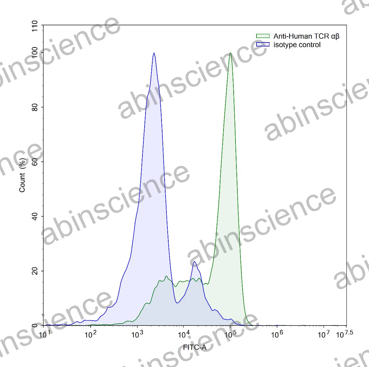 Flow-cytometry using anti-human TCR αβ antibody.Human peripheral blood lymphocytes were stained with an irrelevant antibody (Blue Histogram) or an anti-human TCR αβ antibody monoclonal antibody (Catalog # HP370013 ,Green Histogram) at a concentration of 5 µg/ml for 30 mins at RT. After washing, bound antibody was detected using a FITC conjugated goat anti-mouse antibody (Catalog # MF690414) and cells analysed on a NovoCyte Flow Cytometer. |