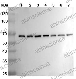 Western blot analysis was performed using anti-Beclin-1 polyclonal antibody at 1ug/mL on various samples.