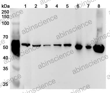 Western blot analysis was performed using anti-SHMT1 polyclonal antibody at 1ug/mL  on various samples. Lane 1: Hela cell lysate Lane 2: Jurkat cell lysate Lane 3: K562 cell lysate Lane 4: MCF-7 cell lysate Lane 5: A431 cell lysate Lane 6: Mouse liver lysate Lane 7: Mouse kidney lysate Lane 8: Rat liver lysate