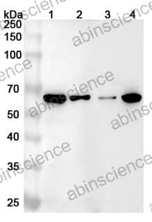 Western blot analysis was performed using anti-WAS polyclonal antibody at 1ug/mL on various samples. Lane 1: Raji cell lysate Lane 2: HL-60 cell lysate Lane 3: Jurkat cell lysate Lane 4: THP-1 cell lysate
