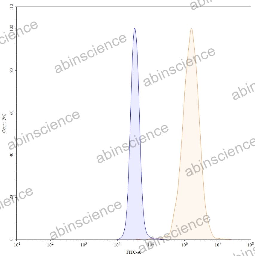 Flow-cytometry using anti-human EGFR antibody. A431 cells were stained with an irrelevant antibody (Blue Histogram) or an anti-human EGFR monoclonal antibody (Catalog HF004036, Yellow Histogram) at a concentration of 5 µg/ml for 30 mins at RT. After washing, bound antibody was detected using a a Goat Anti-Human IgG H&L Polyclonal Antibody, FITC (abinScience: HF690414) and cells analysed on a NovoCyte Flow Cytometer.