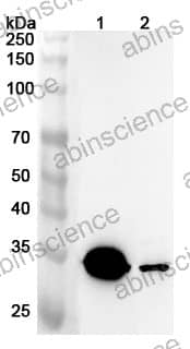 Western blot analysis was performed using anti-ACOT7 polyclonal antibody at 1ug/mL on various samples. Lane 1: Mouse brain lysate Lane 2: Rat brain lysate