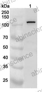 Western blot analysis was performed using anti-MPHOSPH10 polyclonal antibody at 1ug/mL on various samples. Lane 1: Jurkat cell lysate