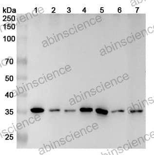 Western blot analysis was performed using anti-PIR polyclonal antibody at 1ug/mL on various samples. Lane 1: HepG2 cell lysate Lane 2: K562 cell lysate Lane 3: NIH3T3 cell lysate Lane 4: A431 cell lysate Lane 5: A375 cell lysate Lane 6: MCF-7 cell lysate Lane 7: Mouse liver lysate
