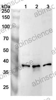 Western blot analysis was performed using anti-POLR1C polyclonal antibody at 1ug/mL on various samples. Lane 1: BxPC-3 cell lysate Lane 2: Hela cell lysate Lane 3: K562 cell lysate