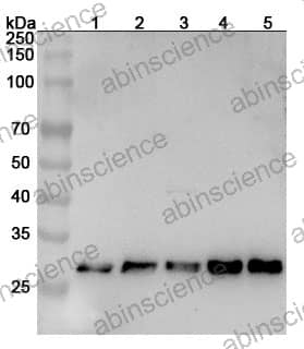 Western blot analysis was performed using anti-MED7 polyclonal antibody at 1ug/mL on various samples. Lane 1: Jurkat cell lysate Lane 2: 293T cell lysate Lane 3: NIH3T3 cell lysate Lane 4: PC-12 cell lysate Lane 5: RAW264.7 cell lysate