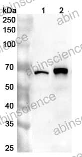 Western blot analysis was performed using anti-PLRG1 polyclonal antibody at 1ug/mL on various samples. Lane 1: NIH3T3 cell lysate Lane 2: Raji cell lysate