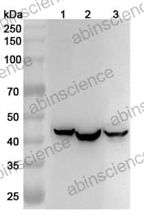Western blot analysis was performed using anti-IDH3B  polyclonal antibody at 1ug/mL on various samples. Lane 1: Mouse brain lysate Lane 2: Mouse heart lysate Lane 3: Rat heart lysate