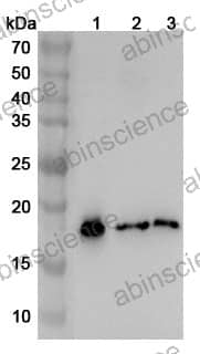 Western blot analysis was performed using anti-MAFK polyclonal antibody at 1ug/mL on various samples. Lane 1: Jurkat cell lysate Lane 2: A549 cell lysate Lane 3: Mouse lung lysate