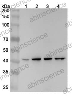Western blot analysis was performed using anti-DNAJA2 polyclonal antibody at 1ug/mL on various samples. Lane 1: A375 cell lysate Lane 2: HepG2 cell lysate Lane 3: Jurkat cell lysate Lane 4: K562 cell lysate