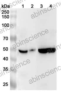 Western blot analysis was performed using anti-FAM20B polyclonal antibody at FAM20B on various samples. Lane 1: Mouse brain lysate Lane 2: Mouse cerebellum lysate Lane 3: Rat brain lysate Lane 4: Rat cerebellum lysate