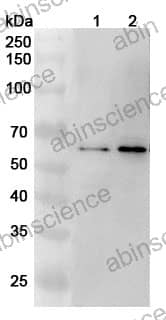 Western blot analysis was performed using anti-GCM2 polyclonal antibody at 1ug/mL on various samples. Lane 1: HepG2 cell lysate Lane 2: NIH3T3 cell lysate