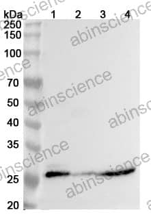 Western blot analysis was performed using anti-ETHE1 polyclonal antibody at ETHE1 on various samples. Lane 1: Mouse kidney lysate Lane 2: Mouse colon lysate Lane 3: Rat liver lysate Lane 4: Rat kidney lysate