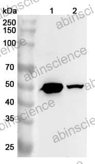Western blot analysis was performed using anti-ESRRB polyclonal antibody at 1ug/mL on various samples.
