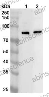 Western blot analysis was performed using anti-ECD polyclonal antibody at ECD on various samples. Lane 1: Mouse brain lysate Lane 2: Rat brain lysate