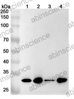 Western blot analysis was performed using anti-GTF2F2 polyclonal antibody at 1ug/mL on various samples. Lane 1: Hela cell lysate Lane 2: K562 cell lysate Lane 3: PC-3 cell lysate Lane 4: 293T cell lysate