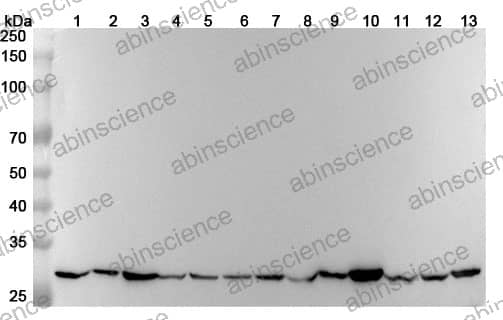 Western blot analysis was performed using anti-PGAM2 polyclonal antibody at 1ug/mL on various samples. Lane 1: Hela cell lysate Lane 2: Jurkat cell lysate Lane 3: A431 cell lysate Lane 4: Raji cell lysate Lane 5: U87 cell lystae Lane 6: Mouse kidney lysate Lane 7: Mouse heart lysate Lane 8: Mouse skeletal muscle lysate Lane 9: Mouse testis lysate Lane 10: Rat kidney lysate Lane11: Rat heart lysate Lane12: Rat skeletal muscle lysate Lane13: Rat testis lysate