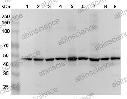 Western blot analysis was performed using anti-TUBG1 polyclonal antibody at 1ug/mL on various samples. Lane 1: NIH3T3 cell lysate Lane 2: HepG2 cell lysate Lane 3: K562 cell lysate Lane 4: Hela cell lysate Lane 5: Jurkat cell lysate Lane 6: A431 cell lysate Lane 7: C2C12 cell lysate Lane 8: U2OS cell lysate Lane 9: A549 cell lysate
