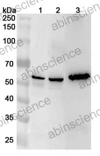 Western blot analysis was performed using anti-CHKA polyclonal antibody at 1ug/mL on various samples. Lane 1: HepG2 cell lysate Lane 2: Raji cell lysate Lane 3: Mouse testis lysate