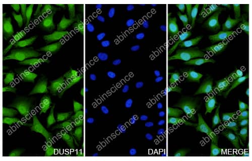 Hela cells were fixed with 4% paraformaldehyde for 20 minutes, followed by blocking with 5% goat serum for 1 hour. The cells were then incubated with a primary antibody targeting DUSP11 (HF776014) at a concentration of 38.4 ug/ml overnight at 4°C. Afterward, the cells were incubated with a secondary antibody, Goat Anti-Rabbit IgG (Alexa Fluor-488) for 50 minutes at room temperature. The localization of DUSP11 was visualized (shown in green), and nuclear DNA was stained with DAPI (shown in blue). |