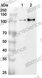 Western blot analysis was performed using anti-USP4 polyclonal antibody at 1ug/mL on various samples. Lane 1: Hela cell lysate Lane 2: Jurkat cell lysate