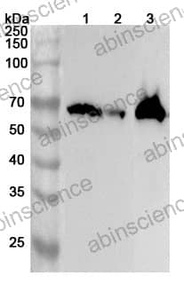 Western blot analysis was performed using anti-ACSM3 polyclonal antibody at 1ug/mL on various samples. Lane 1: Mouse liver lysate Lane 2: Mouse kidney lysate Lane 3: Rat liver lysate