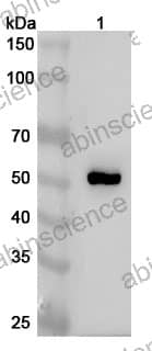 Western blot analysis was performed using anti-IGHG4 polyclonal antibody at 1ug/mL on various samples. Lane 1: Mouse serum lysate