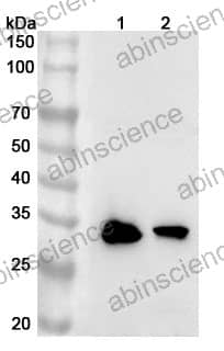 Western blot analysis was performed using anti-CHCHD6 polyclonal antibody at 1ug/mL on various samples. Lane 1: Mosue brain lysate Lane 2: Rat brain lysate