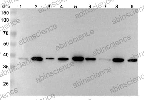 Western blot analysis was performed using anti-MACROH1A2 polyclonal antibody at 1μg/ml on various samples. Lane 1: MCF7 cell lysate Lane 2: Hela cell lysate Lane 3: Rat brain lysate Lane 4: Rat liver lysate Lane 5: 293T cell lysate Lane 6: HepG2 cell lysate Lane 7: Mouse brain lysate Lane 8: Mouse liver lysate Lane 9: Rat lung lysate