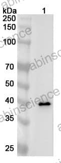 Western blot analysis was performed using anti-AZGP1 polyclonal antibody at AZGP1 on various samples. Lane 1: Mouse serum lysate