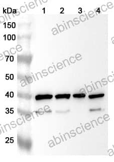 Western blot analysis was performed using anti-CASP8 polyclonal antibody at CASP8 on various samples. Lane 1: Jurkat cell lysate Lane 2: 293T cell lysate Lane 3: HCT116 cell lysate Lane 4: THP-1 cell lysate