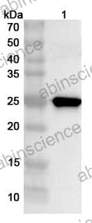 Western blot analysis was performed using anti-ASFV A238L polyclonal antibody at 1ug/mL on recombinant ASFV A238L (Catalog No. VK464012). |