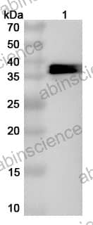 Western blot analysis was performed using anti-E1B polyclonal antibody at 1ug/mL on various samples. Lane 1: recombinant HAdV-5 E1B-55K/E1B-495R (Catalog No: VK466022)