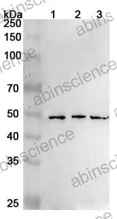 Western blot analysis was performed using anti-RARB polyclonal antibody at 1ug/mL on various samples. Lane 1: HUVEC cell lysate Lane 2: A431 cell lysate Lane 3: A549 cell lysate