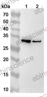 Western blot analysis was performed using anti-CASP3 polyclonal antibody at 1ug/mL on various samples. Lane 1: Jurkat cell lysate Lane 2: Hela cell lysate