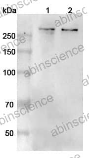 Western blot analysis was performed using anti-TAF1 polyclonal antibody at 1ug/mL on various samples. Lane 1: 293T cell lysate Lane 2: Jurkat cell lysate