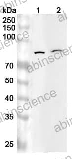 Western blot analysis was performed using anti-MOGS polyclonal antibody at 1ug/mL on various samples. Lane 1: Mouse brain lysate Lane 2: Rat brain lysate