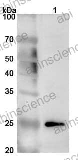 Western blot analysis was performed using anti-METTL5 polyclonal antibody at 1ug/mL on various samples. Lane 1: K562 cell lysate