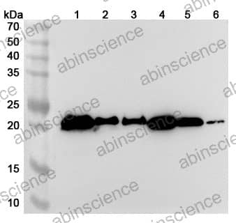 Western blot analysis was performed using anti-TRNAU1AP polyclonal antibody at 1ug/mL on various samples. Lane 1: Mouse brain lysate Lane 2: Mouse lung lysate Lane 3: Mouse colon lysate Lane 4: Rat brain lysate Lane 5: Rat lung lysate Lane 6: Rat colon lysate
