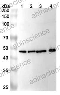 Western blot analysis was performed using anti-ICA1 polyclonal antibody at 1ug/mL on various samples. Lane 1: A549 cell lysate Lane 2: BxPC-3 cell lysate Lane 3: U87 cell lysate Lane 4: Mouse pancears lysate