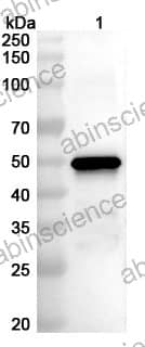 Western blot analysis was performed using anti-EEEV Spike glycoprotein E1 polyclonal antibody at 1ug/mL on recombinant EEEV Spike glycoprotein E1 (Catalog No. VK634042).