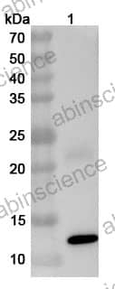 Western blot analysis was performed using anti-PRUP3 polyclonal antibody at 1ug/mL on various samples. Lane 1: recombinant Peach Pru p 1/Pru p 3 (Catalog No: PR104012)