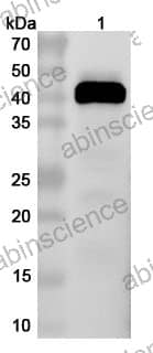 Western blot analysis was performed using anti-Chicken Gal d 2/OVA/Ovalbumin polyclonal antibody at 1ug/mL on recombinant Chicken Gal d 2/OVA/Ovalbumin (Catalog No. GP552012).